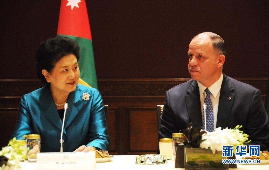 4月20日,在約旦首都安曼,約旦代國(guó)王費(fèi)薩爾(右)會(huì)見中國(guó)國(guó)務(wù)院副總理劉延?xùn)|。新華社記者林曉蔚攝