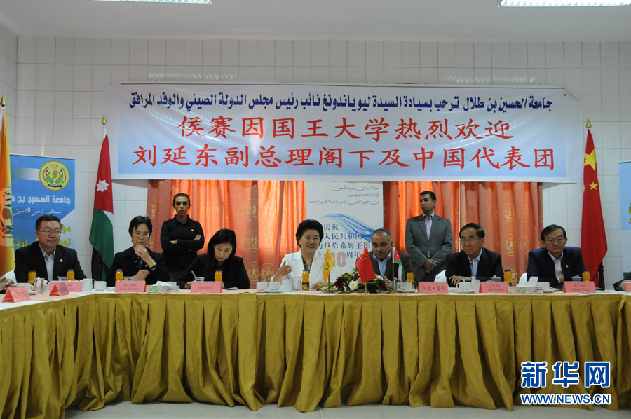 4月21日,在約旦佩特拉,中國國務院副總理劉延東(中)訪問約旦侯賽因國王大學。 新華社記者林曉蔚攝
