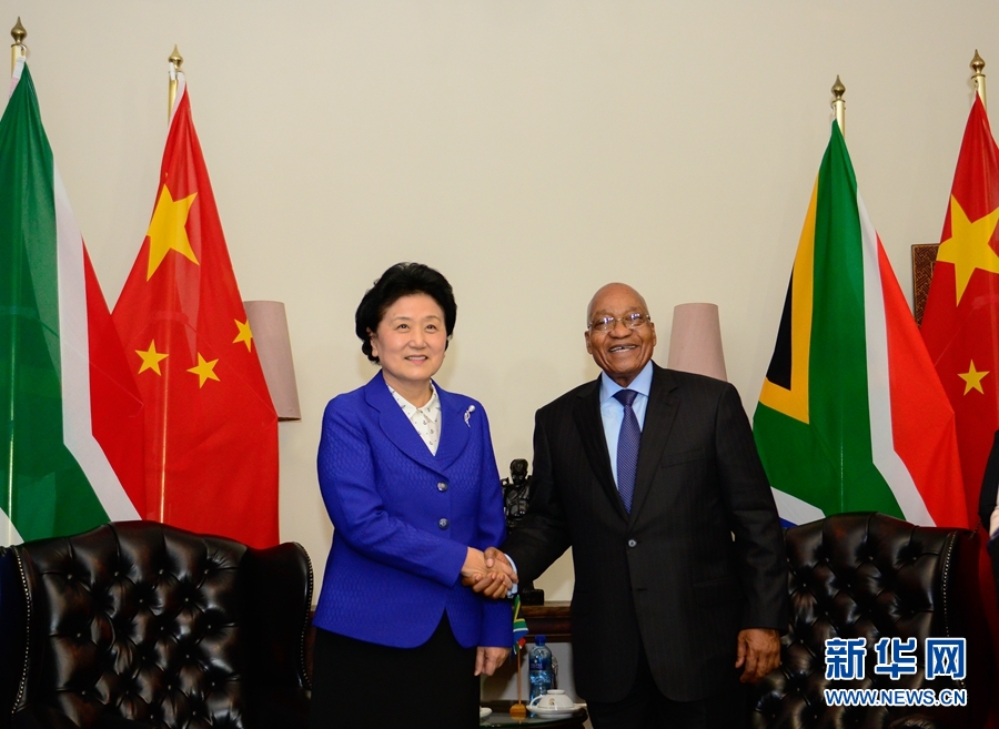 4月25日,南非總統(tǒng)祖馬(右)在比勒陀利亞總統(tǒng)官邸會(huì)見(jiàn)正在對(duì)南非進(jìn)行正式訪(fǎng)問(wèn)并出席中南高級(jí)別人文交流機(jī)制首次會(huì)議的中國(guó)國(guó)務(wù)院副總理劉延?xùn)|。 新華社記者 翟健嵐 攝