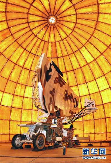 駐守藏北某雷達(dá)站擔(dān)負(fù)節(jié)日值班工作的官兵,精心檢查維護(hù)雷達(dá)天線(xiàn),確?!扒Ю镅邸泵髁粒?011年1月30日攝)。新華社發(fā)(劉應(yīng)華 攝)