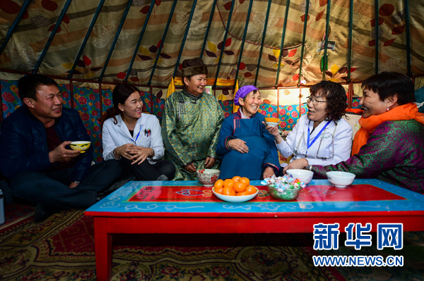 家庭責(zé)任醫(yī)務(wù)人員與阿巴嘎旗牧民道力格爾瑪一家拉家常(2月20日攝)。為緩解牧民看病難問題,從2013年起,阿巴嘎旗給超出衛(wèi)生院服務(wù)半徑10公里的每戶牧民配備小藥箱,安排家庭責(zé)任醫(yī)生,還購買了12臺內(nèi)置B超機(jī)、心電圖機(jī)、尿液分析儀等醫(yī)療設(shè)備的流動服務(wù)車。新華社記者 連振 攝