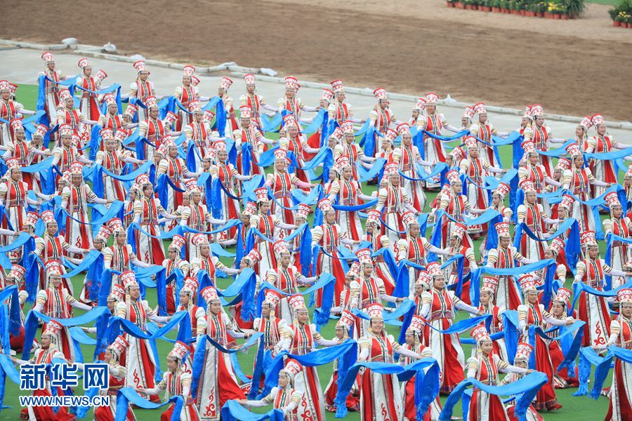 8月8日,內蒙古自治區(qū)成立70周年慶祝大會在呼和塔拉內蒙古少數民族群眾文化體育運動中心舉行。圖為群眾行進表演。新華網記者 陳杰 攝