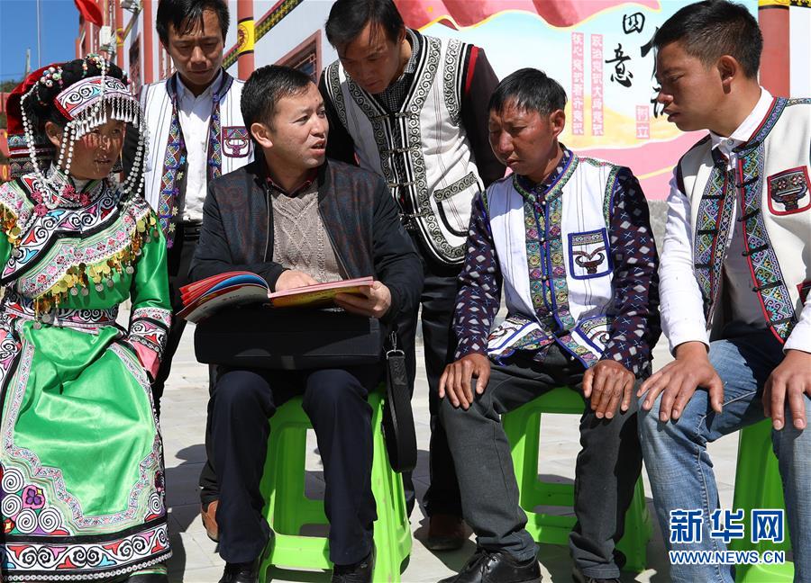 10月31日,十九大代表、貴州省六盤水市鐘山區(qū)大灣鎮(zhèn)海嘎村駐村第一書記楊波(前左二)向海嘎村彝族村民宣講十九大精神。新華社記者 劉續(xù) 攝