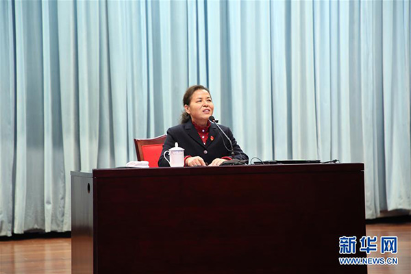 孫金娣組織“貫徹十九大,聽總書記話,永遠(yuǎn)跟黨走”黨員群眾大會,并進(jìn)行宣講(11月10日攝)?!⌒氯A社記者楊紹功攝