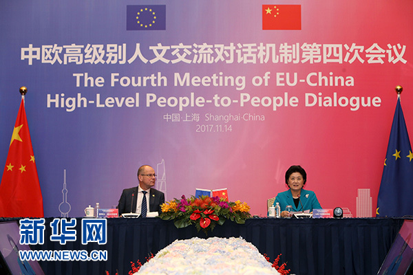 11月14日,國務院副總理劉延東與歐盟委員會教育、文化、青年和體育委員瑙夫勞契奇作為機制雙方主席在上海共同主持中歐高級別人文交流對話機制第四次會議。新華社記者 劉穎 攝