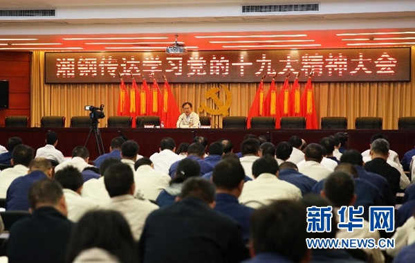 10月30日,王樹春向湖南華菱湘潭鋼鐵有限公司員工宣講黨的十九大精神。十九大代表、湖南華菱湘潭鋼鐵有限公司黨委書記王樹春從北京回到鋼廠,下車后直奔會議室,激動地向等待在此的班子成員傳達十九大精神。對這個流著紅色血液、有著9693名黨員、剛剛擺脫生存困境的老鋼廠來說,十九大精神無疑帶來了新希望、吹響了新號角。新華社發(fā)