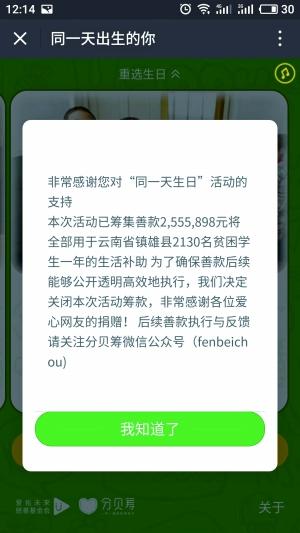 近日,“同一天生日”為貧困山區(qū)孩子籌款這一活動在朋友圈刷屏,但與此同時,被疑造假、信息有誤等聲音也出現(xiàn)在網(wǎng)端。對此,活動主辦方分貝籌創(chuàng)始人微博回應稱,最初僅為測試傳播率發(fā)到朋友圈,因未詳細檢查孩子信息導致大家誤解。北京晨報記者發(fā)現(xiàn),昨天中午平臺顯示系統(tǒng)升級,已無法籌款。