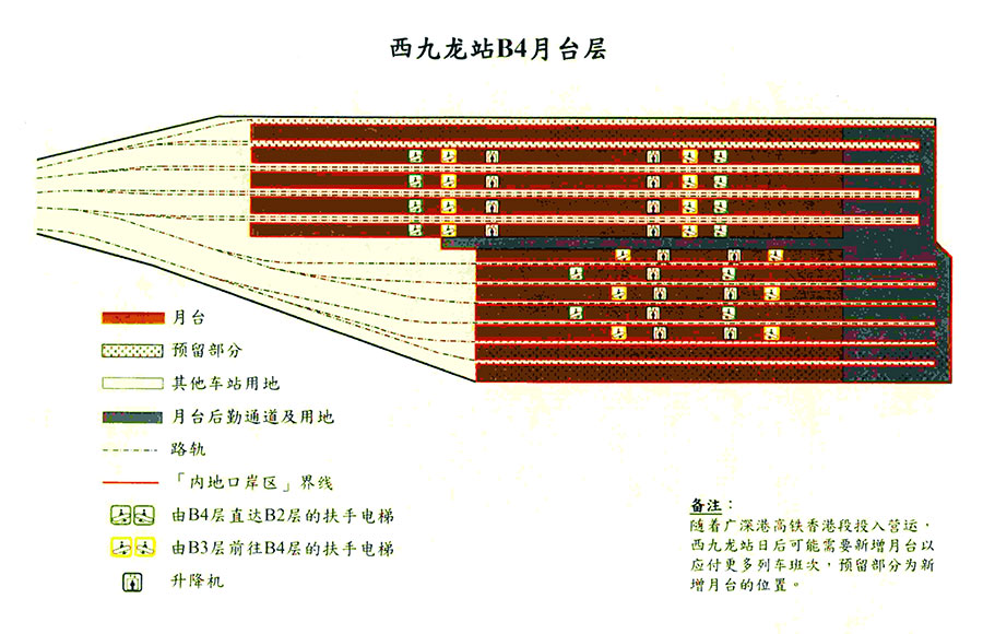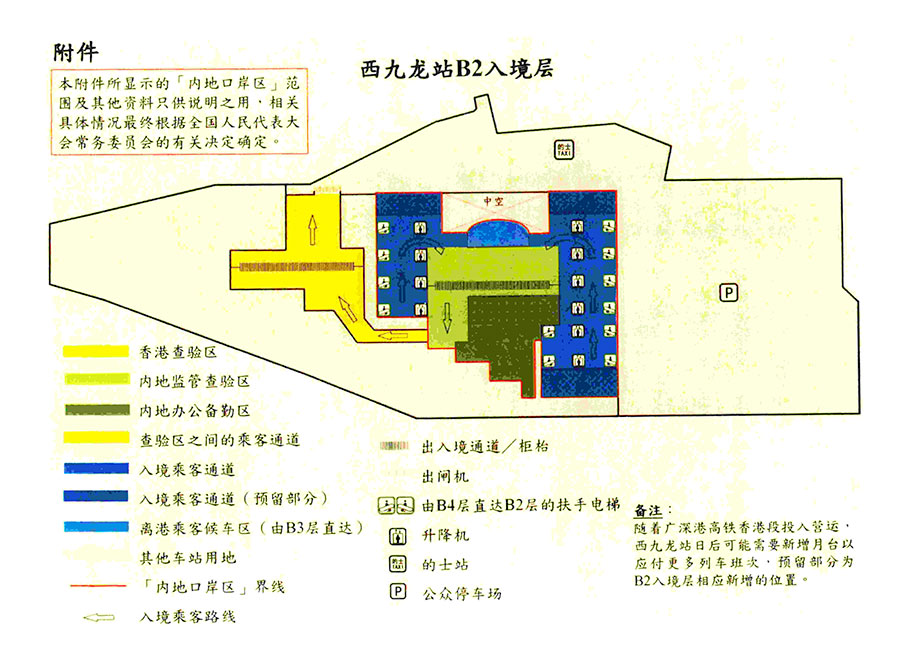 第二條 內(nèi)地口岸區(qū)的范圍為西九龍站地下二、三層的劃定區(qū)域、地下四層月臺區(qū)域及有關(guān)連接通道,包括內(nèi)地監(jiān)管查驗區(qū)、辦公備勤區(qū)、離港乘客候車區(qū)、車站月臺和連接通道及電梯。內(nèi)地口岸區(qū)范圍的詳情見附件。