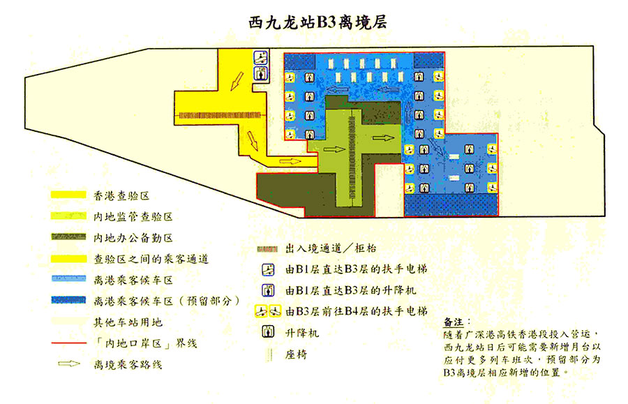 西九龍站口岸分為香港口岸區(qū)和內(nèi)地口岸區(qū)。香港口岸區(qū)由香港特區(qū)依據(jù)特區(qū)法律設(shè)立和管轄,實行過境限制區(qū)管理。內(nèi)地口岸區(qū)由內(nèi)地根據(jù)本合作安排和內(nèi)地法律設(shè)立和管轄,實行口岸管理制度。