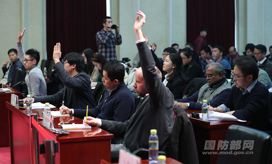 12月28日下午,國(guó)防部舉行例行記者會(huì),國(guó)防部新聞局副局長(zhǎng)、國(guó)防部新聞發(fā)言人任國(guó)強(qiáng)大?;卮鹩浾咛釂?wèn),圖為例會(huì)現(xiàn)場(chǎng)。李曉偉 攝