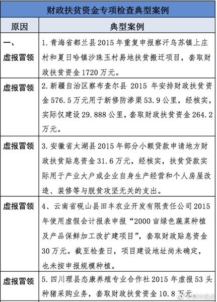 “發(fā)現(xiàn)一起、查處一起、絕不姑息!”財政部監(jiān)督檢查局有關(guān)負(fù)責(zé)人指出,此次檢查發(fā)現(xiàn)了一批違法違規(guī)問題,本著“零容忍”態(tài)度已進(jìn)行了嚴(yán)肅處理。從檢查發(fā)現(xiàn)問題中的一些典型案例看,虛報冒領(lǐng)、擠占挪用、違規(guī)招投標(biāo)、盲目決策導(dǎo)致資金大量浪費、精準(zhǔn)扶貧貫徹落實不到位是當(dāng)前濫用扶貧資金的主要問題所在。