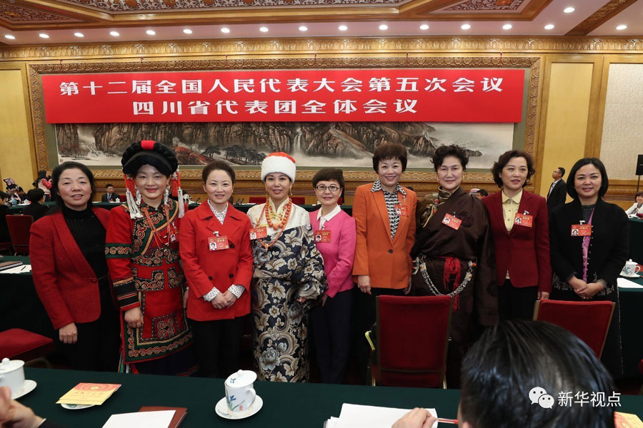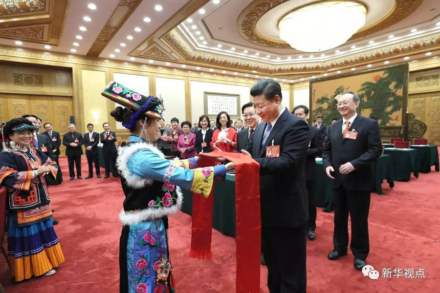四川是一個多民族聚居的省份。習近平走進會場時,身著民族服裝的藏族、彝族、羌族代表向總書記問好。藏族、羌族代表分別獻上了潔白的哈達和鮮艷的羌紅,表達對總書記的敬意,祝福中華民族繁榮昌盛。習近平請他們轉(zhuǎn)達對各族同胞的祝福。
