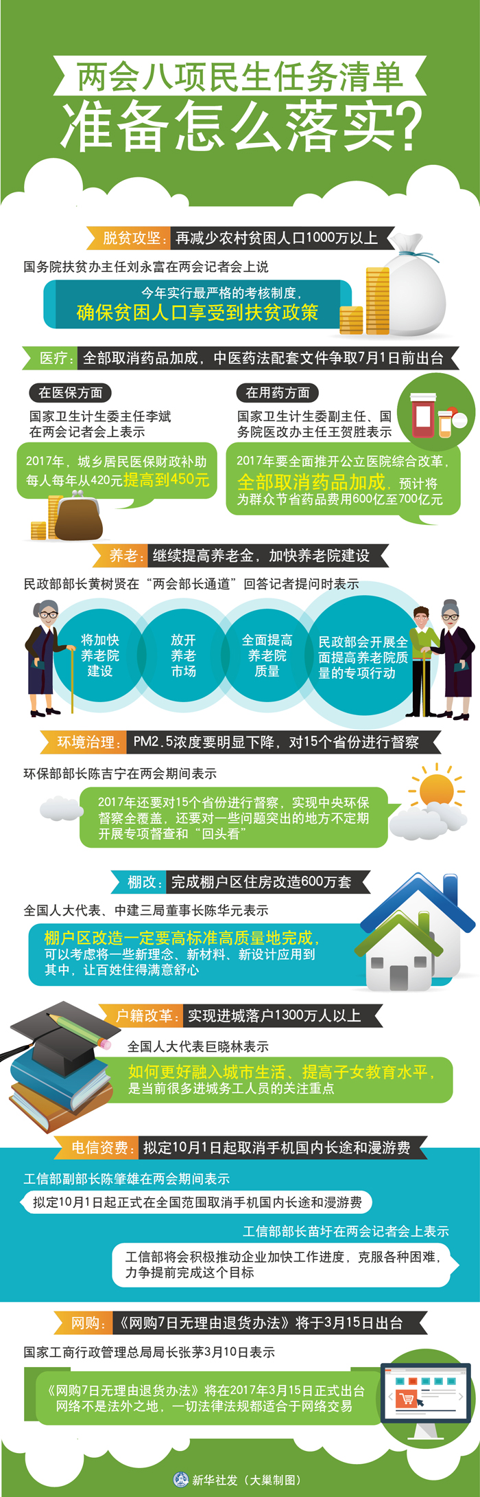 圖表:兩會(huì)八項(xiàng)民生任務(wù)清單準(zhǔn)備怎么落實(shí)? 新華社發(fā) 大巢制圖