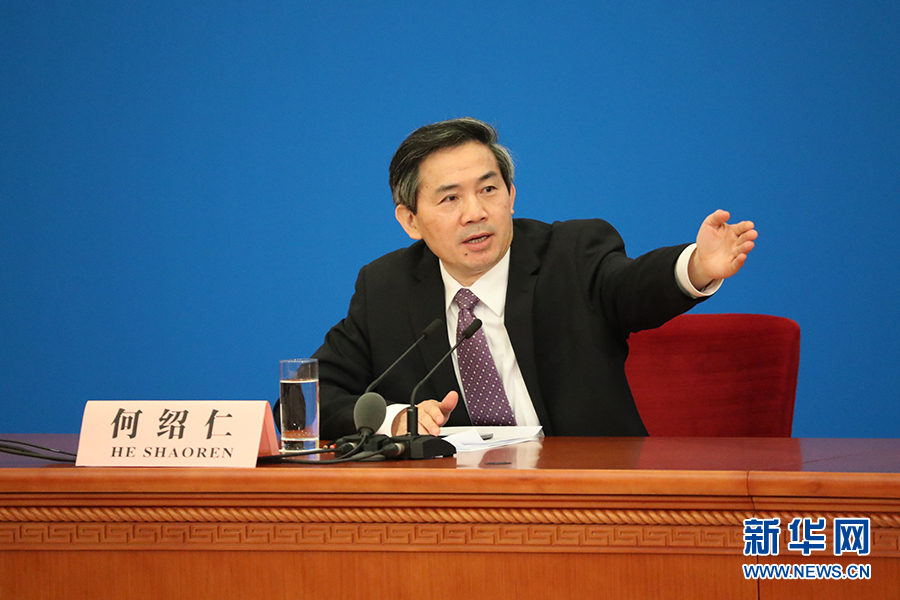 3月15日上午,國(guó)務(wù)院總理李克強(qiáng)在人民大會(huì)堂三樓金色大廳會(huì)見采訪十二屆全國(guó)人大五次會(huì)議的中外記者并回答記者提出的問(wèn)題。圖為記者會(huì)主持人何紹仁。新華網(wǎng)/中國(guó)政府網(wǎng)?孫韜 攝