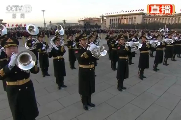 2018年元旦升國(guó)旗儀式最大亮點(diǎn),就是有八名禮號(hào)手登上吹奏臺(tái)吹響號(hào)角,嘹亮的號(hào)聲將劃破夜空,迎來2018年的第一縷曙光。