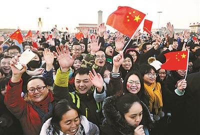 “再堅(jiān)持一下,還有30分鐘?!碧?yáng)升起前氣溫低至-5℃至-6℃。在等待的人群中,大家相互鼓勵(lì)。7時(shí)25分,“中國(guó),加油!”不知道誰(shuí)在隊(duì)伍里喊了一句,緊接著,一陣又一陣的歡呼聲,一浪高過(guò)一浪,直到升旗儀式開(kāi)始。