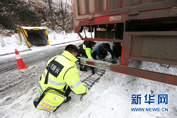 湖北五峰土家族自治縣仁和坪鎮(zhèn)“路長”高恩強(qiáng)(左一)在楊柳池村到金家垴路段指導(dǎo)過往貨車安裝防滑鏈(1月5日攝)。新華社記者 王自宸 攝