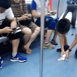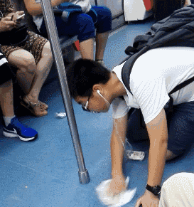 江蘇無錫地鐵1號線上,一個小男孩在用紙巾擦拭地面上的臟物,持續(xù)了十分鐘,直到擦干凈。?