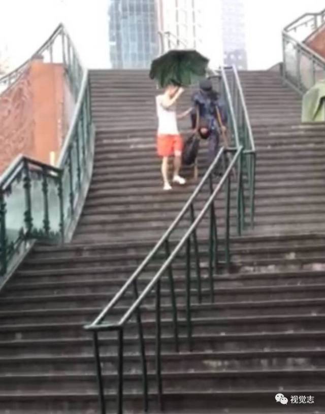 下雨天,人們匆匆趕路,一個小哥哥在幫一個乞討老人撐傘,慢慢扶他下樓梯。
