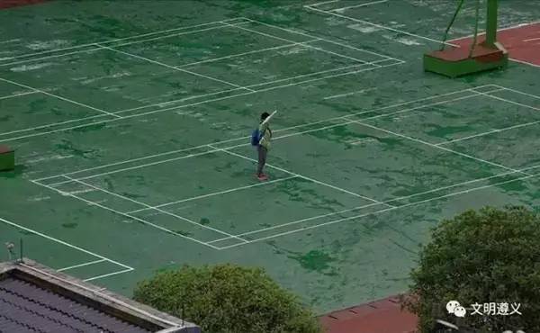 當(dāng)他跑到操場時,突然聽到國歌聲響起,他立刻佇立風(fēng)雨中面向國旗敬禮。