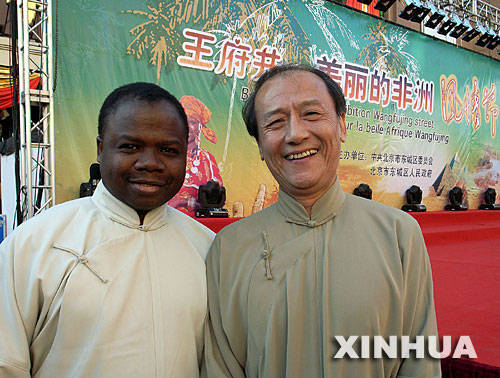 資料圖片:2006年10月31日,中國(guó)相聲演員丁廣泉(右)和他的非洲徒弟在王府井步行街參加非洲風(fēng)情節(jié)活動(dòng)時(shí)合影。
