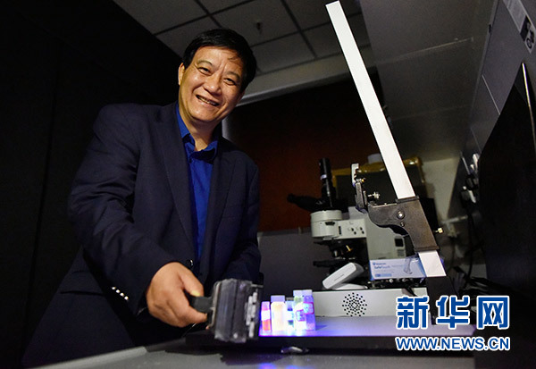 1月18日,唐本忠在向記者展示聚集誘導(dǎo)發(fā)光材料。新華社發(fā) (王璽 攝)