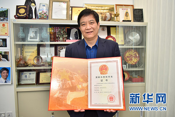 1月18日,唐本忠向記者展示他獲得的2017年度國家自然科學(xué)獎(jiǎng)一等獎(jiǎng)證書。新華社發(fā) (王璽 攝)