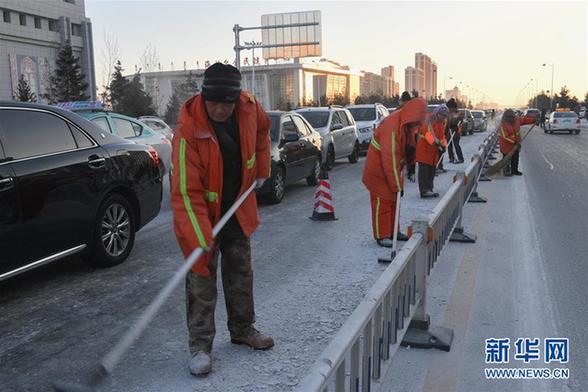 內(nèi)蒙古自治區(qū)呼倫貝爾市冬季漫長(zhǎng)。12月22日,環(huán)衛(wèi)工人在道路上清雪除冰。新華社記者 劉磊 攝