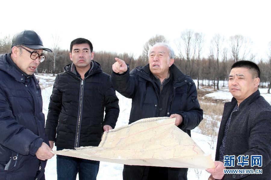 2016年3月14日,王樹清(右二)在黑龍江省拜泉縣國富鎮(zhèn)通肯村和當?shù)馗刹恳?guī)劃植樹造林。新華社發(fā)