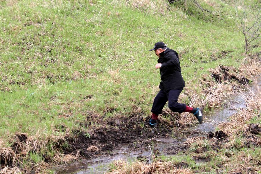 2016年5月25日,王樹清在黑龍江省拜泉縣國富鎮(zhèn)愛護村查看造林地塊時跳過一條水溝。新華社發(fā)