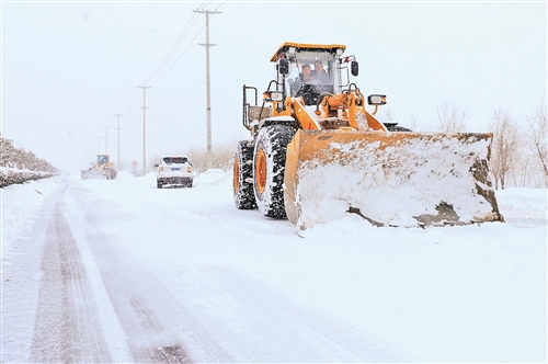 1月27日,大型機(jī)械正在安徽廬江縣境內(nèi)的G330合(肥)銅(陵)公路清理積雪。連日來,廬江縣遭遇持續(xù)強(qiáng)降雪。為保暢通、保民生,廬江縣各級(jí)各部門以及沿路鎮(zhèn)、村近萬名干部群眾,投入437臺(tái)各類鏟雪除冰機(jī)械,上路清理該縣境內(nèi)合銅公路、二軍公路、巢廬公路等7條重要國(guó)省干線道路積雪,全力以赴抗擊冰雪保暢通。