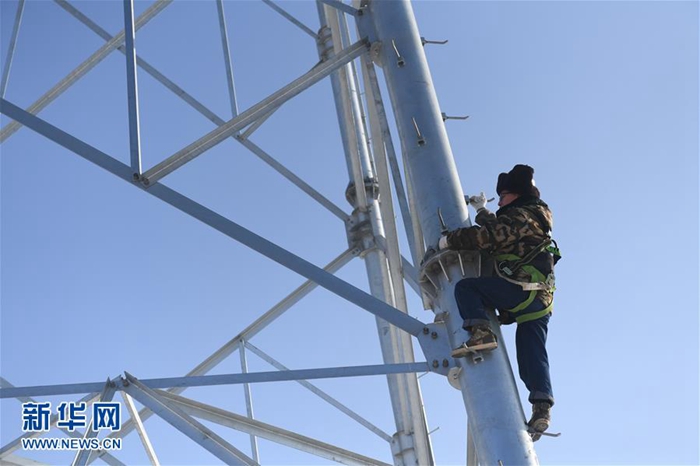 1月26日,國家電網(wǎng)長春供電公司輸電運(yùn)檢室?guī)щ娮鳂I(yè)班班長楊忠武徒手爬上高壓線塔。新華社記者 張楠 攝