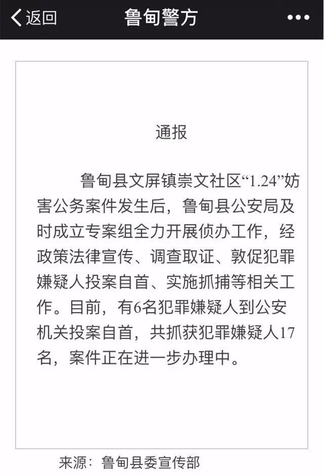 1月26日,云南昭通魯?shù)榭h委宣傳部就“不法者圍攻干警”一事通報稱,目前有6名犯罪嫌疑人已到公安機(jī)關(guān)投案自首,共抓獲犯罪嫌疑人17名,案件正在進(jìn)一步辦理中。