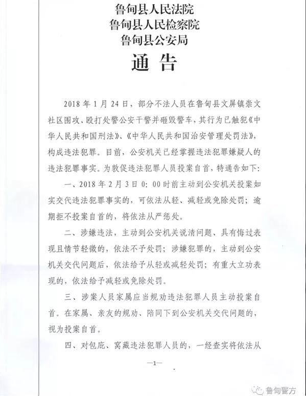 與此同時,魯?shù)榭h公安局、法院、檢察院聯(lián)合發(fā)出通告稱,部分不法人員在魯?shù)榭h文屏鎮(zhèn)崇文社區(qū)圍攻、毆打處警公安干警并砸毀警車,其行為已觸犯《中華人民共和國刑法》、《中華人民共和國治安管理處罰法》,構(gòu)成違法犯罪,公安機(jī)關(guān)已經(jīng)掌握違法犯罪嫌疑人的違法犯罪事實,限期在2月3日凌晨0點前主動到公安機(jī)關(guān)投案自首、交代違法犯罪事實,可依法從輕、減輕或免除處罰,逾期拒不投案自首的,將依法嚴(yán)懲。