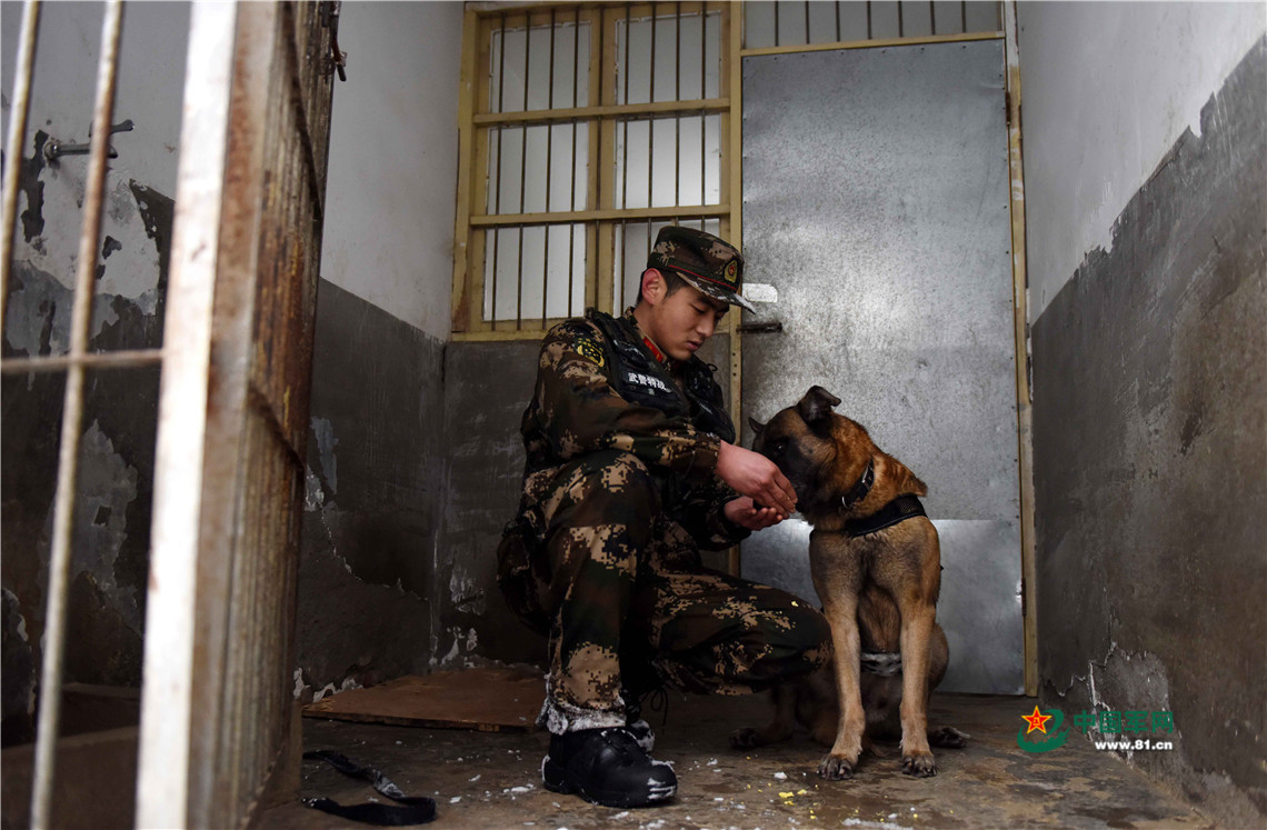 1月27日,武警安徽總隊(duì)機(jī)動(dòng)支隊(duì)警犬班班長(zhǎng)王營(yíng)廣在給警犬“魯克”喂食煮雞蛋。