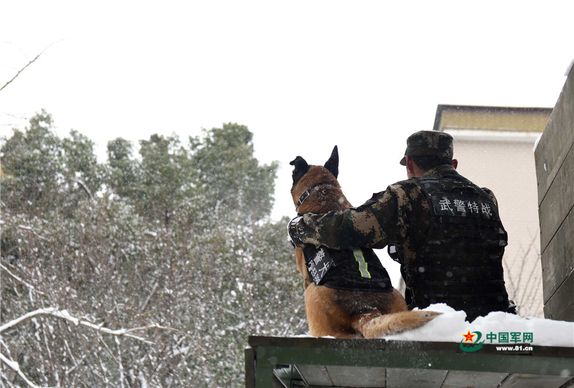 1月27日,武警安徽總隊機動支隊警犬班班長王營廣與警犬“魯克”互動交流,增進情感。