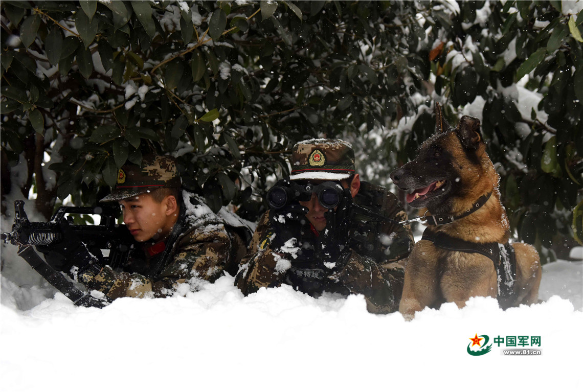 1月27日,武警安徽總隊機動支隊警犬班班長王營廣帶領警犬“魯克”進行隱蔽偵察訓練。