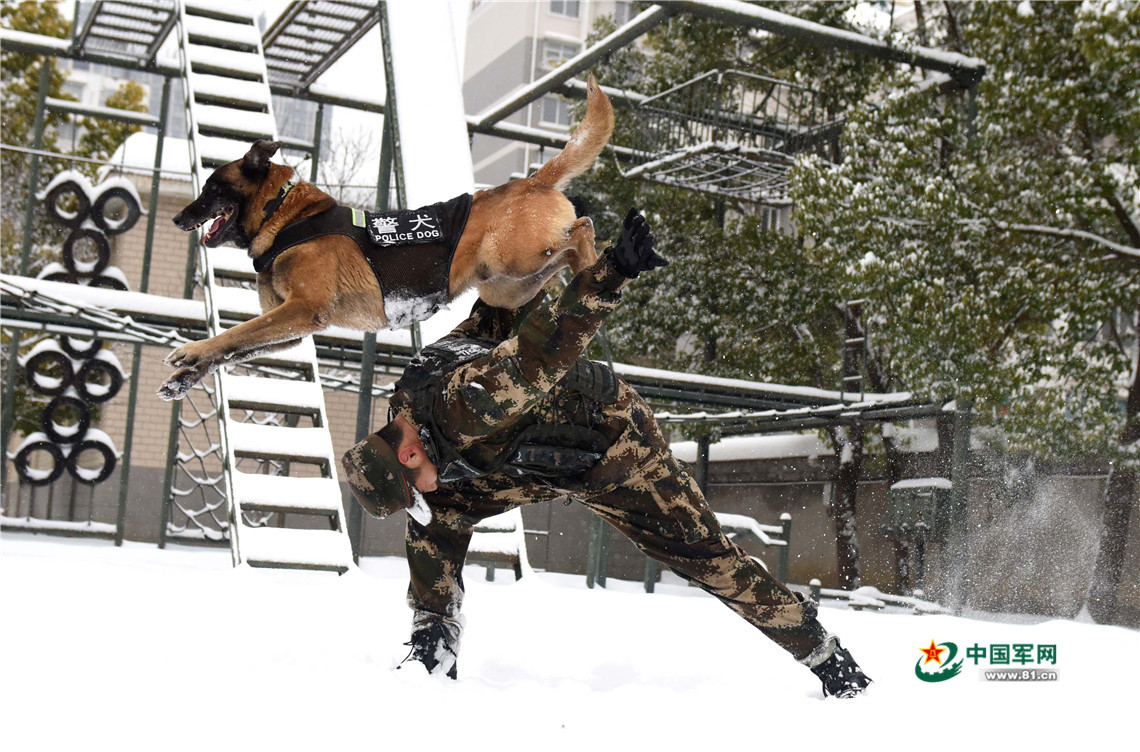 1月27日,武警安徽總隊機動支隊警犬班班長王營廣與警犬“魯克”進行人犬結(jié)合訓練。