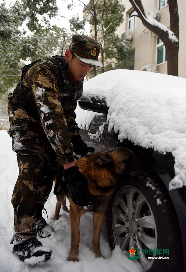 1月27日,武警安徽總隊機動支隊警犬班班長王營廣帶領(lǐng)警犬“魯克”進行車輛搜爆訓(xùn)練。