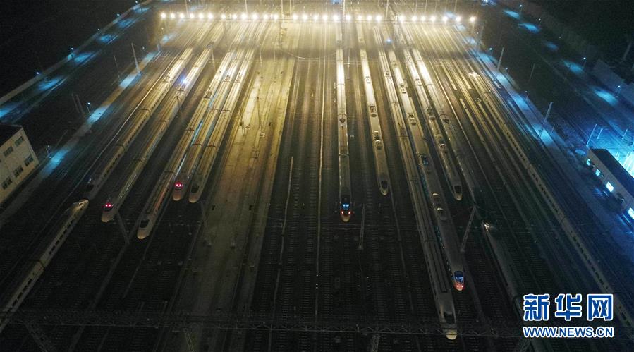 這是1月31日清晨在貴陽北動(dòng)車運(yùn)用所拍攝的動(dòng)車組列車。春運(yùn)即將開始,貴陽北動(dòng)車運(yùn)用所各個(gè)系統(tǒng)的工作人員對動(dòng)車組列車進(jìn)行全面細(xì)致的“體檢”,確保春運(yùn)期間動(dòng)車組列車安全運(yùn)行。新華社發(fā) 吳吉斌 攝
