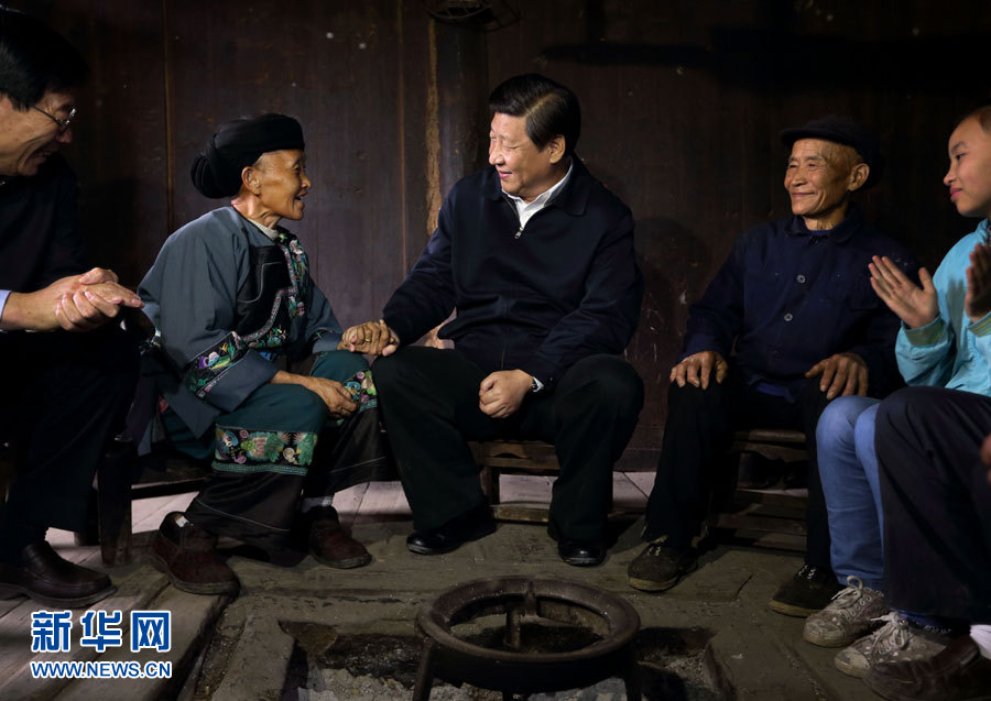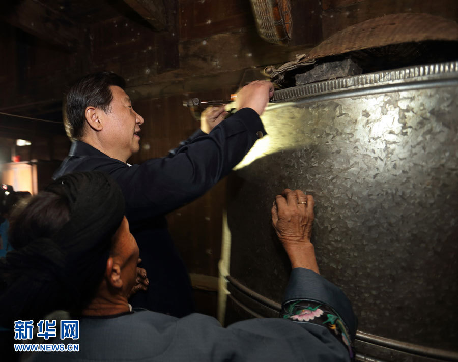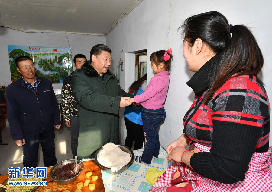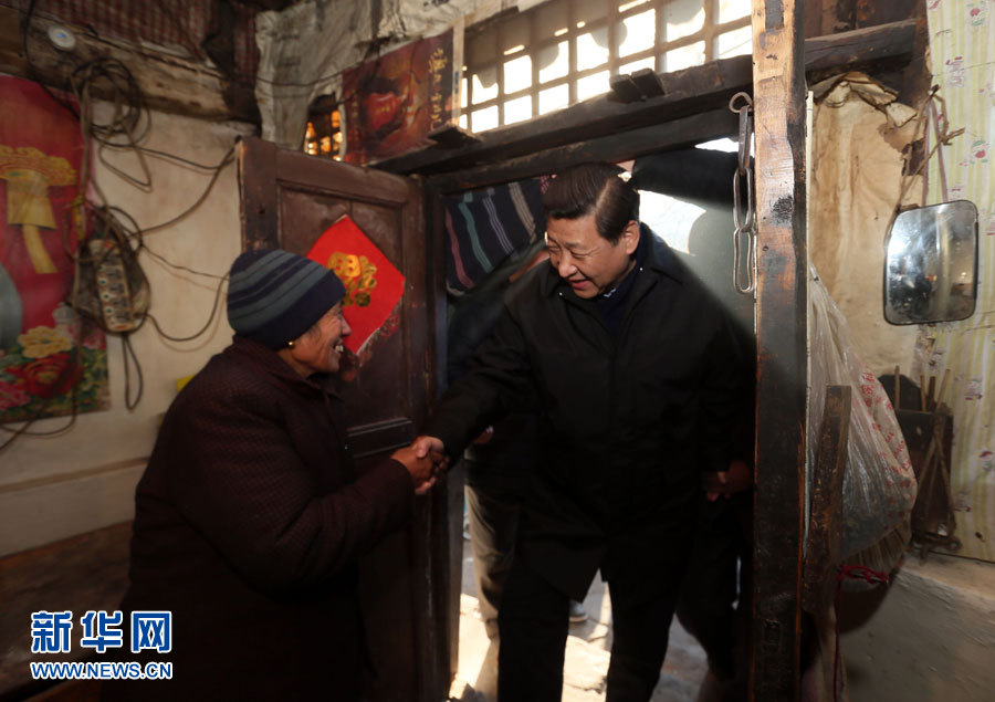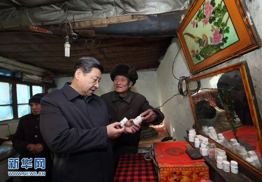 在河北阜平龍泉關(guān)鎮(zhèn)駱駝灣村困難戶(hù)唐榮斌家,習(xí)近平拿起桌上的藥瓶仔細(xì)查看,囑咐老人多多保重身體。