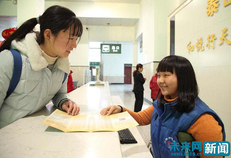由于李厚萱行動不便,志愿服務(wù)期間她的母親田秀云全程陪同。李厚萱在咨詢臺工作的時候,閑下來的田秀云便幫忙整理、分發(fā)列車時刻表,是泰山火車站“特殊”春運志愿者。