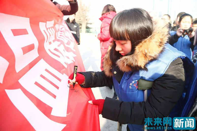 李厚萱拄著雙拐,在泰山火車站“暖冬行動”的承諾條幅上簽字。(受訪者供圖)