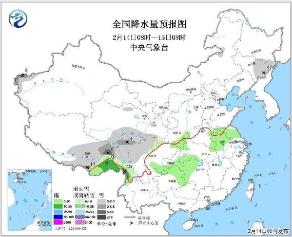 全國(guó)降水量預(yù)報(bào)圖(2月14日08時(shí)-15日08時(shí))