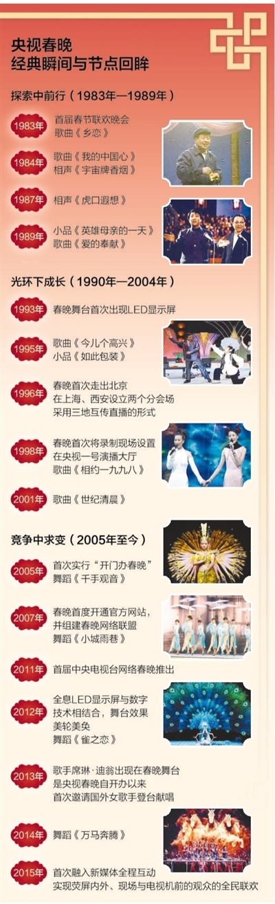 “春節(jié)聯(lián)歡晚會(huì)”這頓電視“年夜飯”即將迎來第三十五個(gè)年頭,除夕夜看央視春晚早已成為中國人過年的新民俗。明星上春晚代表其在業(yè)界的地位,新人在春晚上露臉則是“一夜成名”的“捷徑”,觀眾樂于在春節(jié)過后點(diǎn)評春晚節(jié)目……春晚不僅是一方舉國歡慶的民俗舞臺,更是受到全民關(guān)注的國家文化工程,是新時(shí)期以來少有的用普通百姓喜聞樂見的方式形塑主流價(jià)值觀的文化空間。