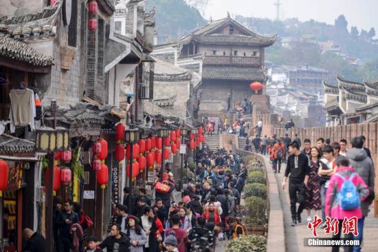 2月17日,正值農(nóng)歷大年初二,湖南鳳凰古城內(nèi)人頭攢動,眾多海內(nèi)外游客選擇來到鳳凰古城感受新春年味。 楊華峰 攝