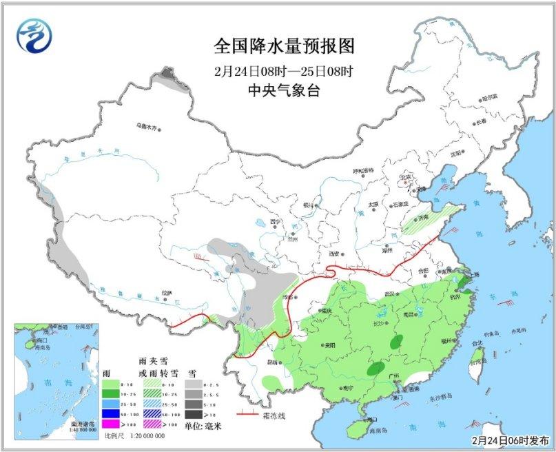 24日08時至25日08時,新疆北部、西藏西部、川西高原、青海東南部、山東北部等地有小到中雪或雨夾雪,局地大雪;云南東部、江漢南部、江南大部、華南大部等地有小雨,局地中雨。華北南部、黃淮、江漢東部、江淮北部等地及環(huán)渤海地區(qū)有4~6級風。黃海中部、東海北部等海域將有5~7級、陣風8級的東北風。