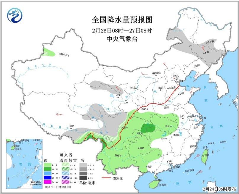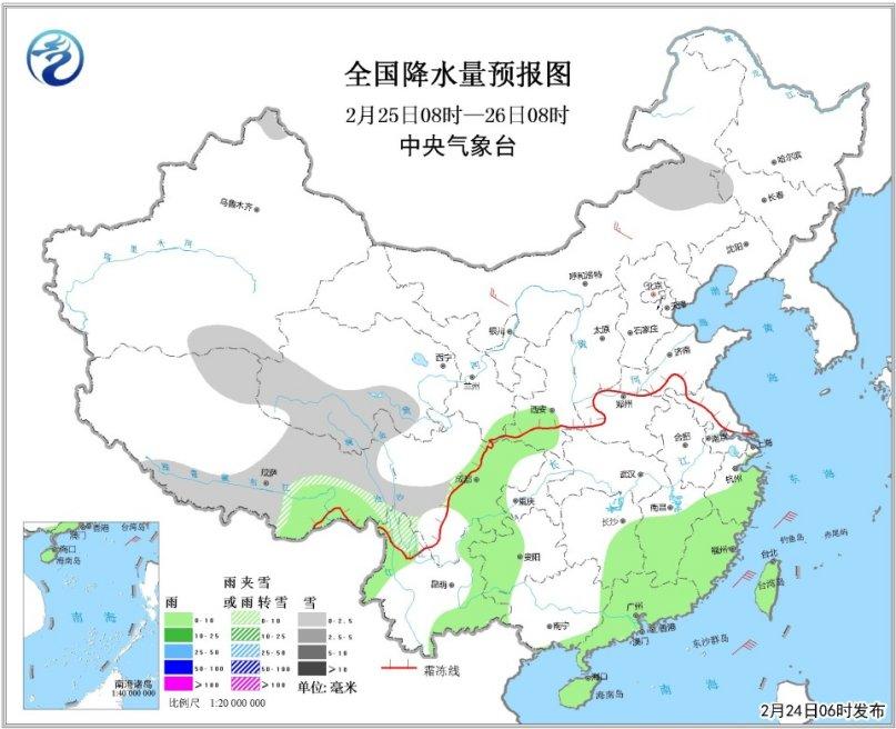 25日08時至26日08時,青藏高原中部和南部等地有小雪或雨夾雪;西北地區(qū)東南部、四川盆地、江南南部、華南中東部、云南西北部和東部、海南島、臺灣等地有小雨或陣雨。內蒙古中西部等地有4~5級風。東海大部、臺灣海峽等海域有6~7級、陣風8級的東北風。