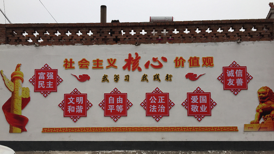 圖為南石村委辦公樓對面引人注目的標(biāo)語。新華網(wǎng)記者 陳麗 攝