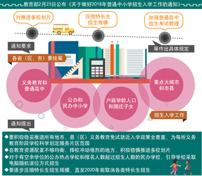 為進一步治理義務教育階段“擇校熱”,解決中小學招生入學工作中的熱點難點問題,教育部23日公布《關于做好2018年普通中小學招生入學工作的通知》,對推進多校劃片、壓縮特長生招生規(guī)模、加強普通高中招生考試管理等作出具體規(guī)定。>>